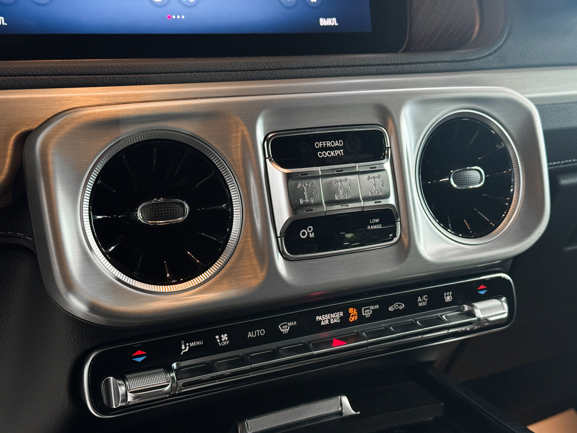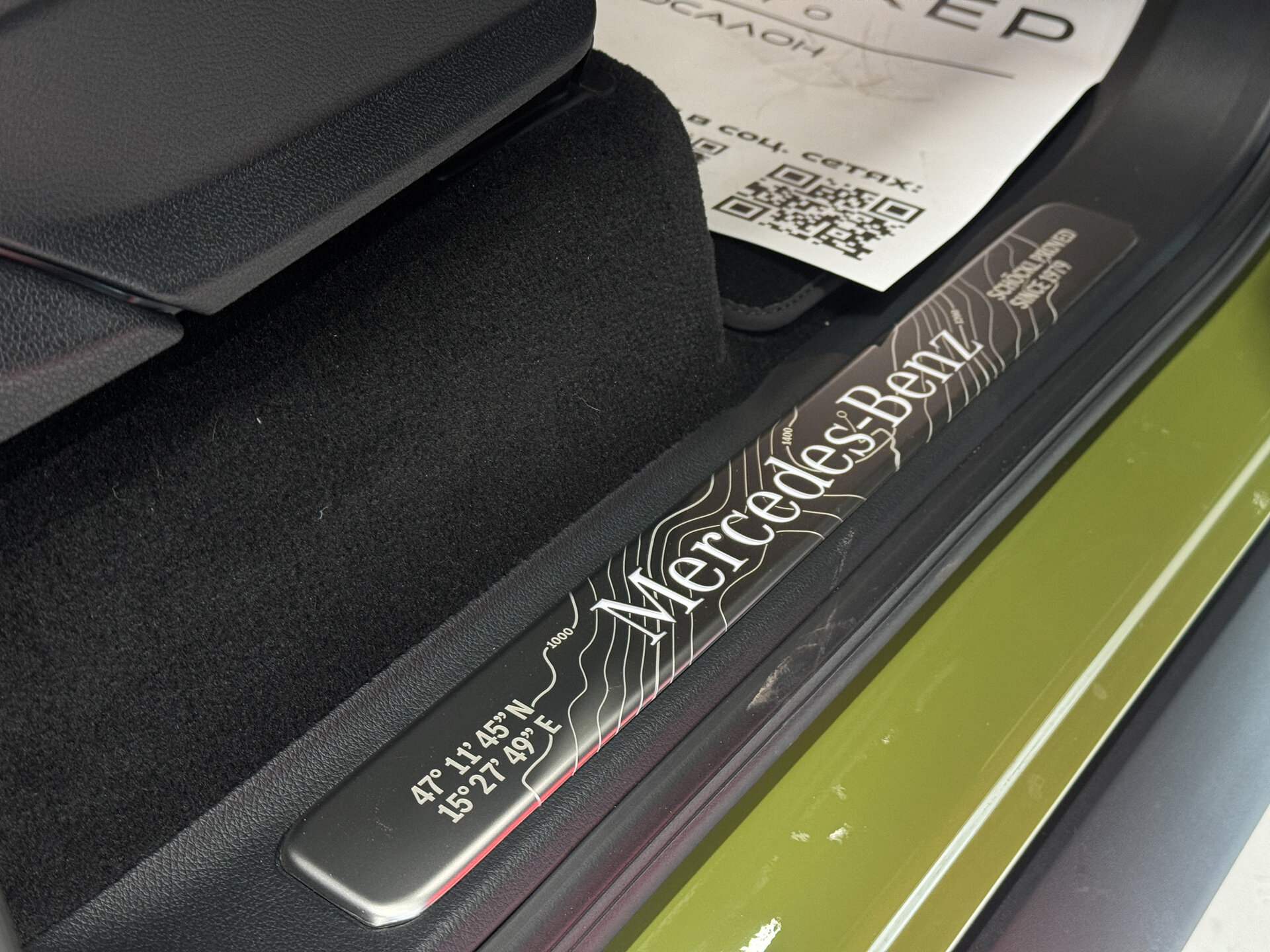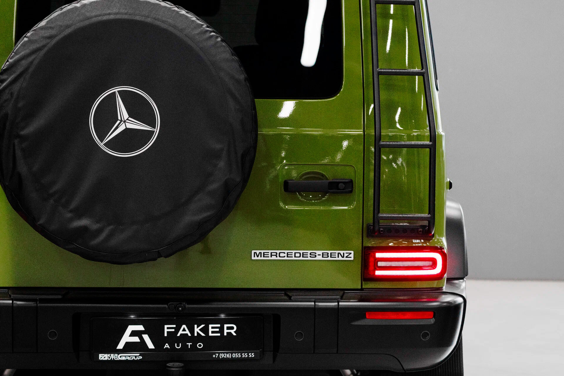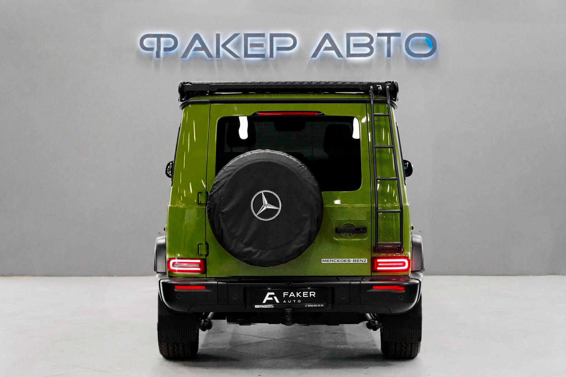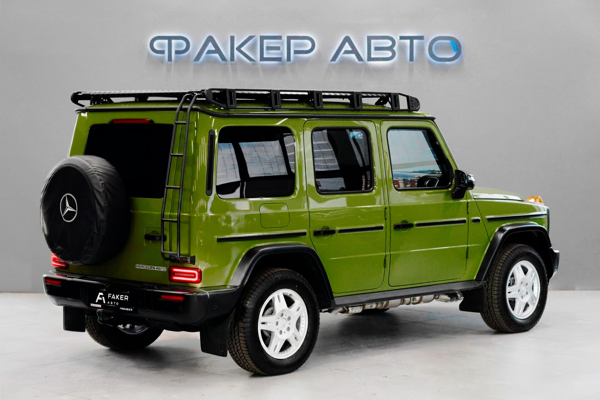 Чёрная облицовка передка; оранжевые поворотники; чёрные бамперы и колёсные арки; силовая защита днища. На капоте — историческая эмблема с синей подложкой. На багажной двери — серебристый шильдик с чёрной надписью Mercedes‑Benz и винтажный чехол запаски.