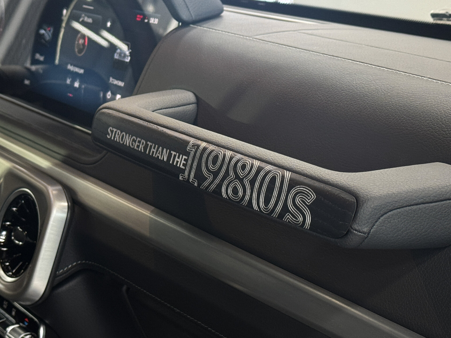 — Надпись «STRONGER THAN THE 1980s» на поручне переднего пассажира
